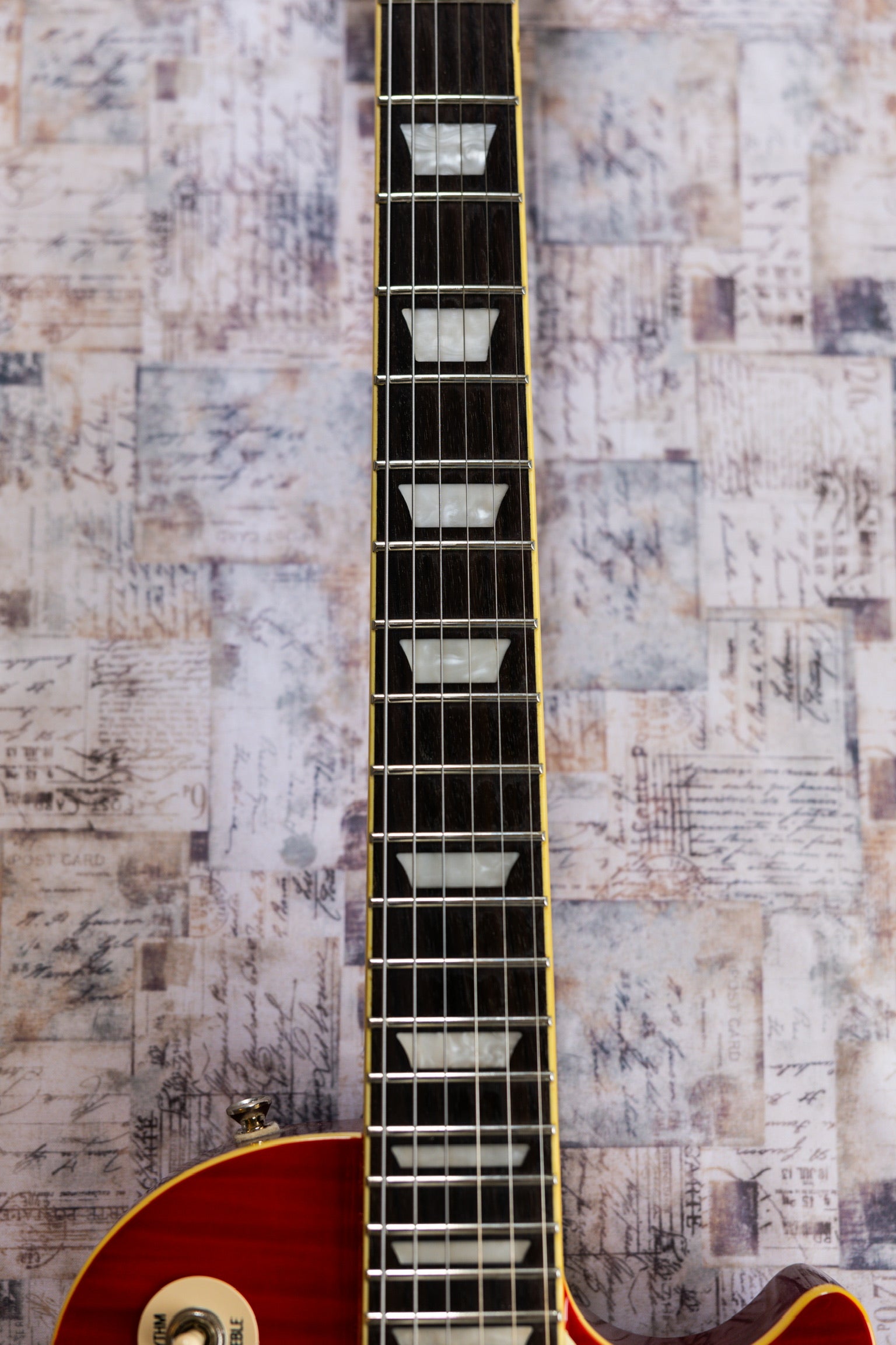 The neck feels incredible—silky smooth with polished frets that play like butter. It was professionally set up by Sam Ash, so the action is nice and low with clean intonation across the board. It’s also seen very little playtime, so it still feels fresh and tight.