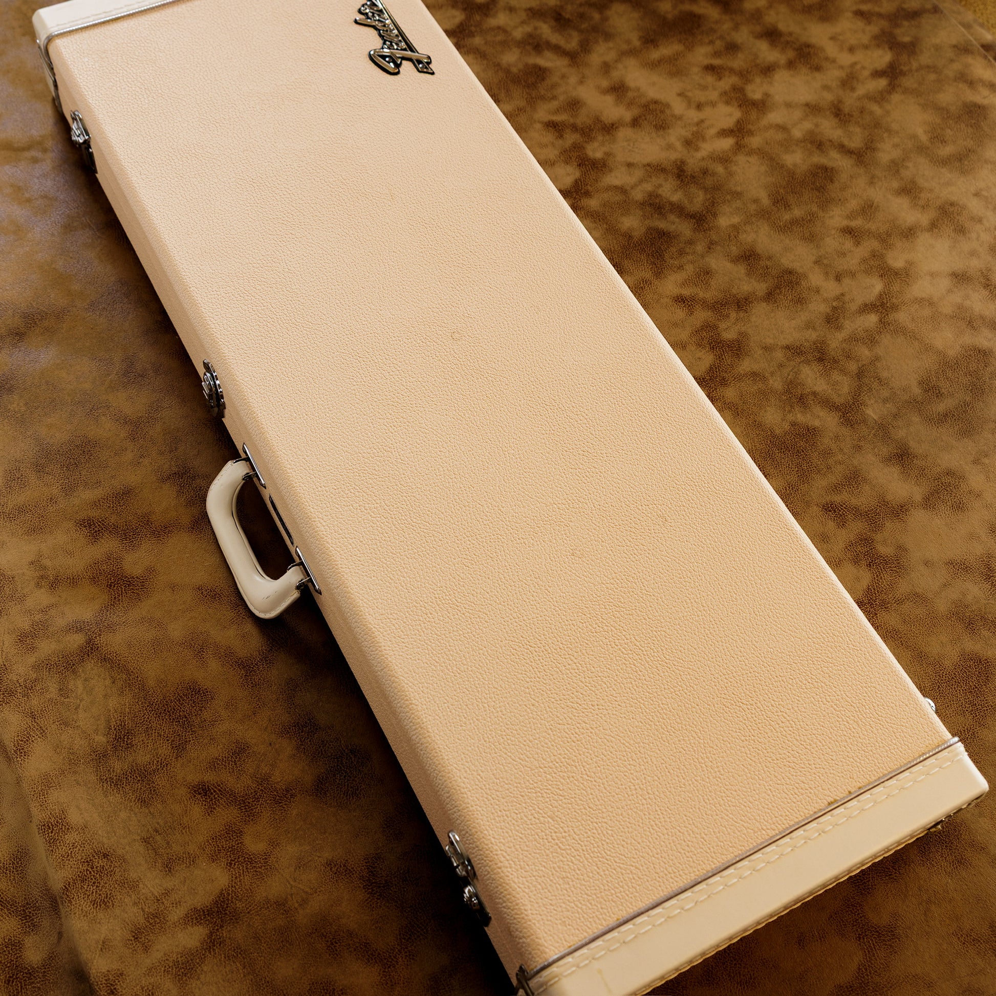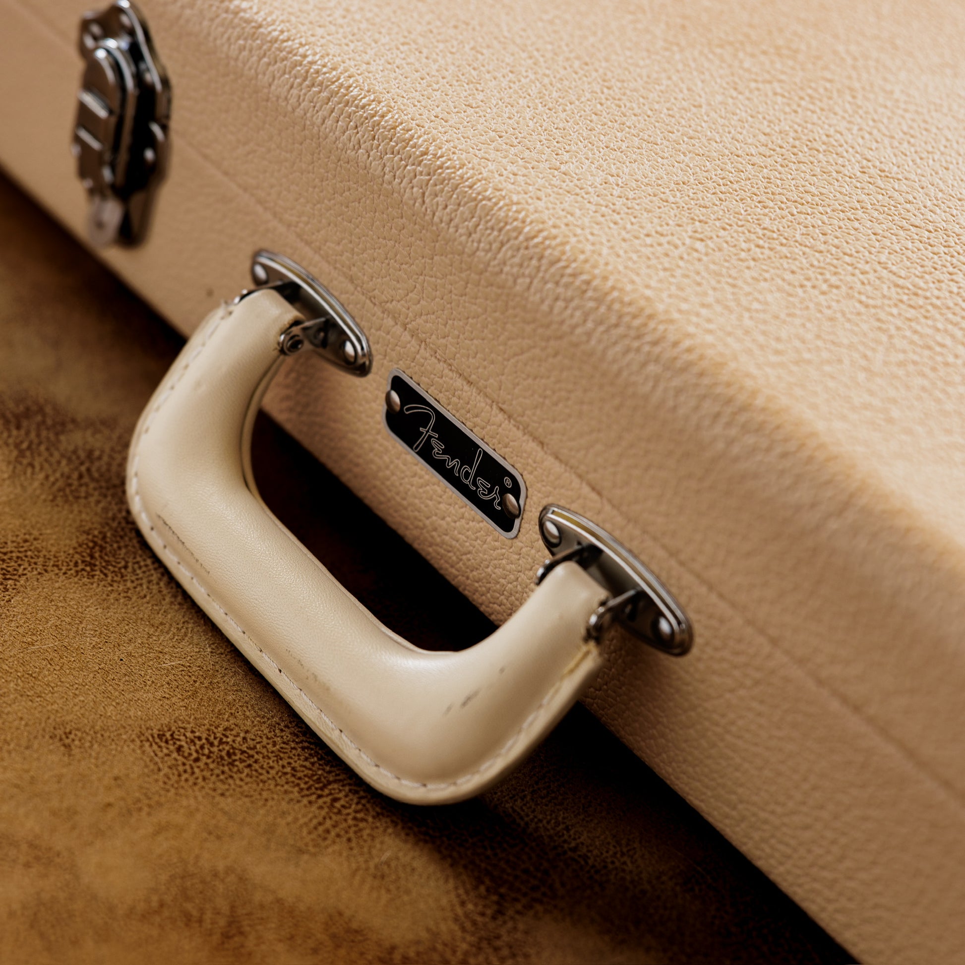 And then there’s the case. The matching cream / soft pink vintage Fender tweed case is genuinely one of the nicest Fender cases I’ve ever seen. The exterior looks fantastic, the white interior lining is beautiful, and it’s in great shape overall. It complements the guitar perfectly and completes the whole Mary Kaye experience.
