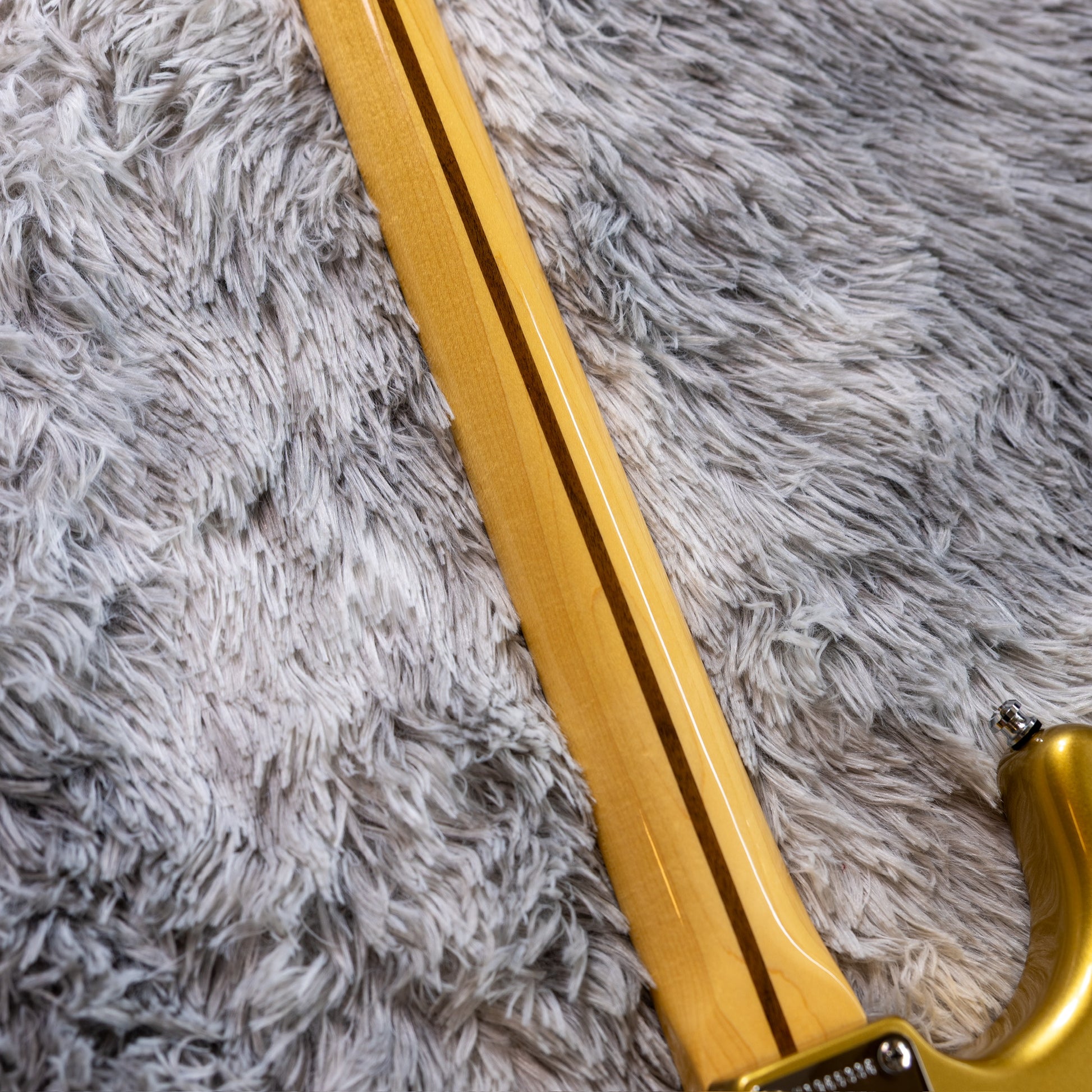 This guitar is in like-new condition, the kind that makes you double-take and wonder if it ever left the house. The gold is deep and metallic without being gaudy, shifting from warm honey to a shimmering bronze depending on the angle. The maple fretboard is clean, smooth, and feels instantly familiar—classic ‘50s Fender under your hand, bright and snappy with that unmistakable clarity.