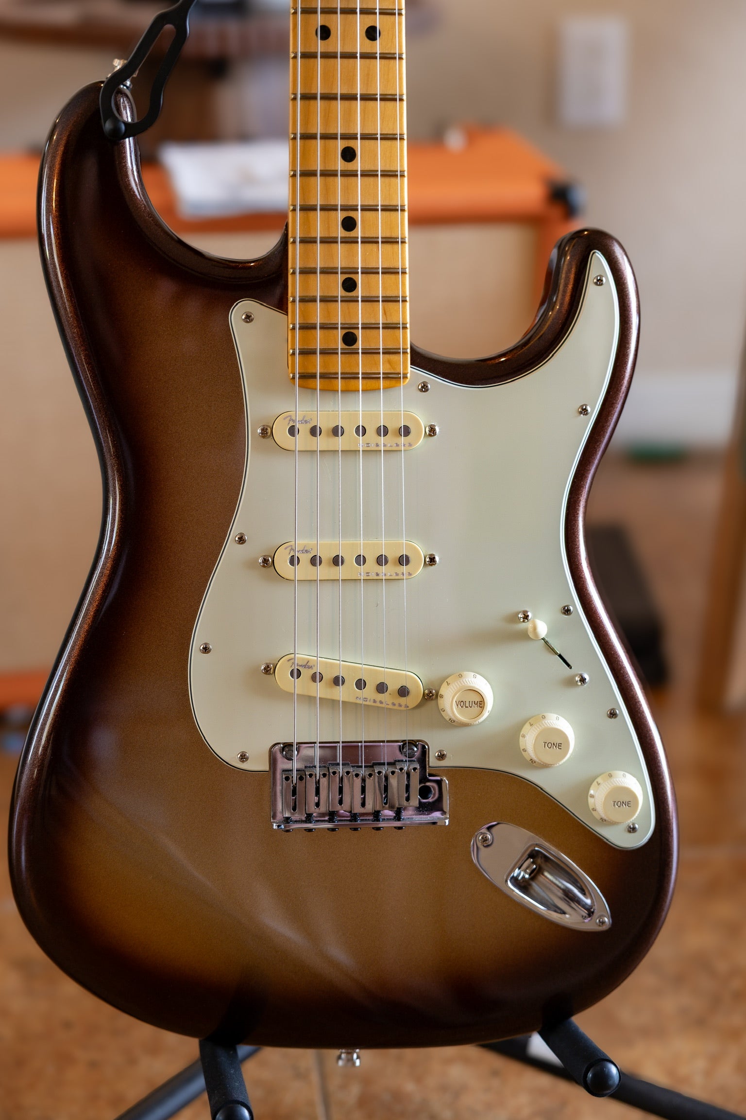 Here’s a 2024 Fender American Ultra Strat in the super rare and jaw-dropping Mocha Burst finish—not something you see every day. It’s in mint condition, virtually unplayed, and looks like it just came off the wall at Fender HQ.