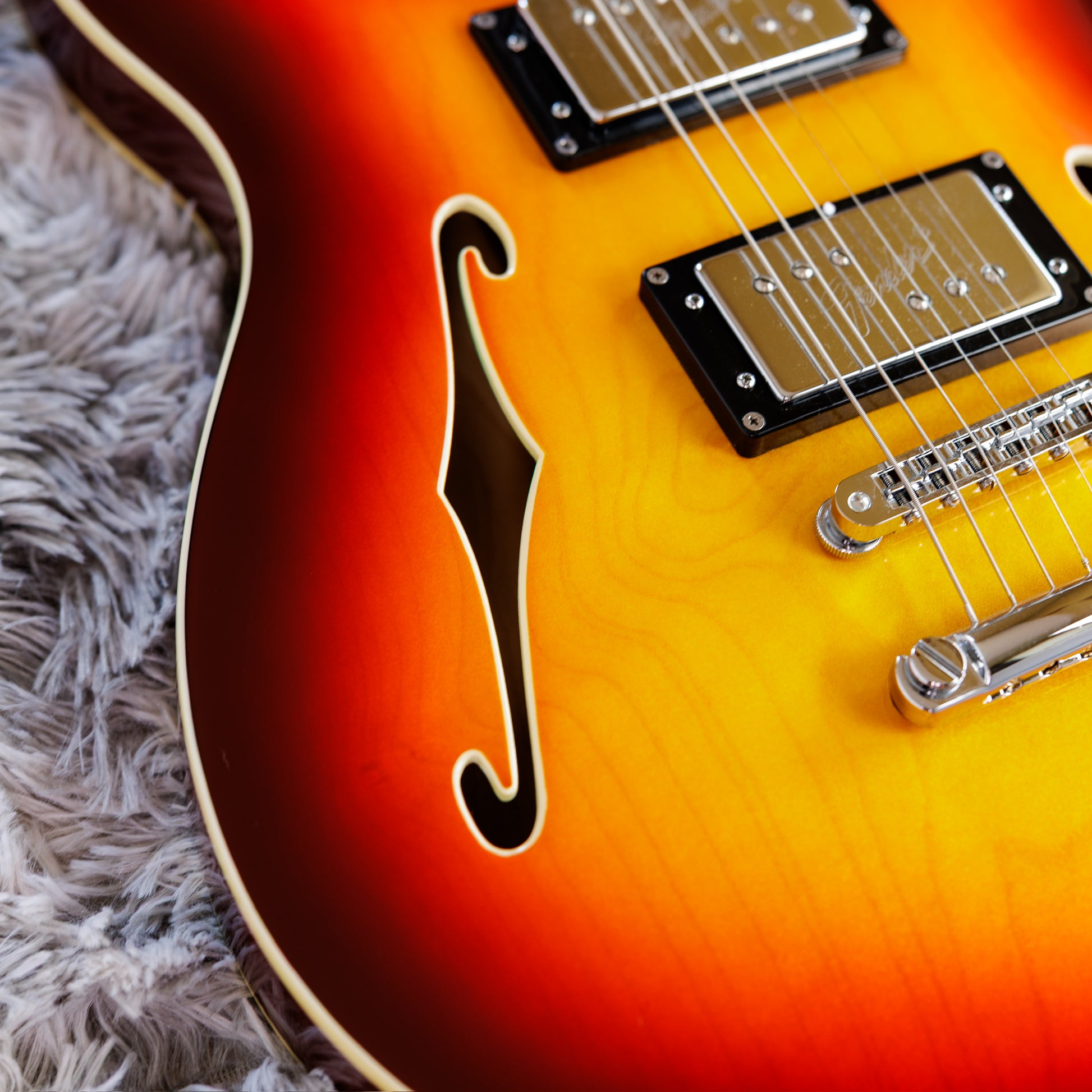 Finished in a gorgeous Aged Cherry Burst, this one absolutely nails the vintage-meets-modern vibe. The semi-hollow body gives it that airy resonance and warmth, while still feeling tight and responsive in the hands. It’s a guitar that invites you to play longer than you planned to.