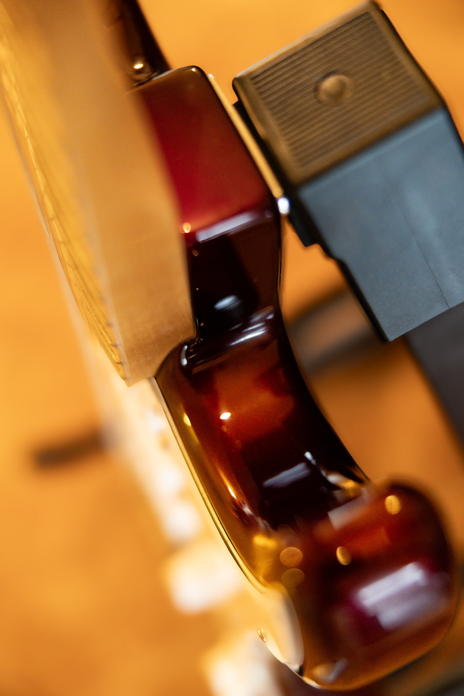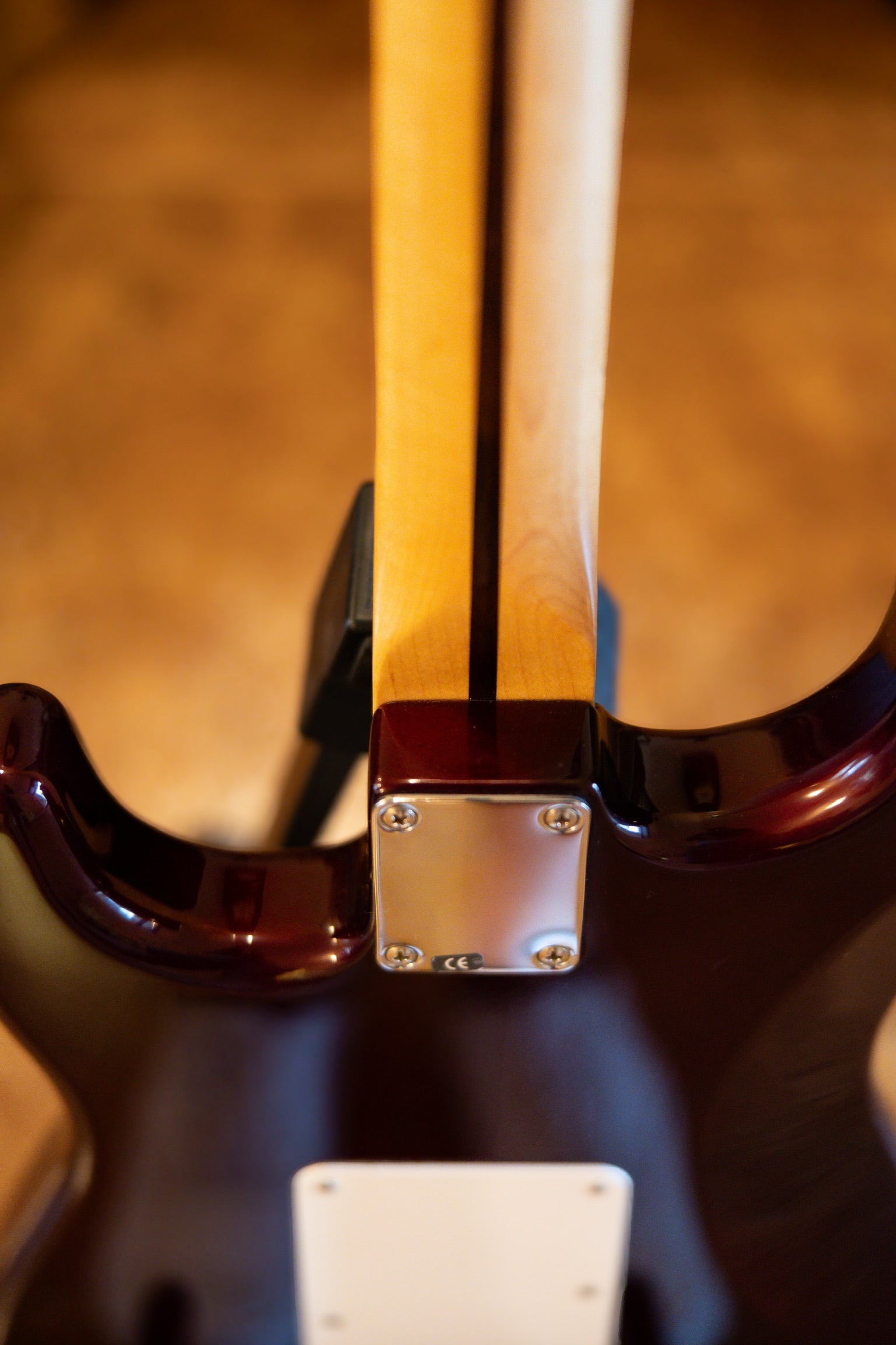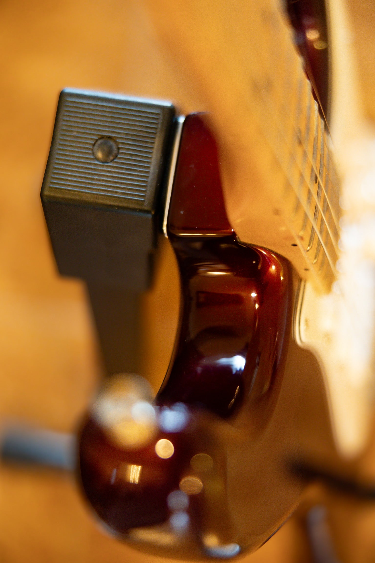 This Fender Stratocaster in Wine Red is a stunning guitar that’s in great condition, with a few of light scratches and a small chip that has been filled (pictured), but nothing that affects its playability or tone.