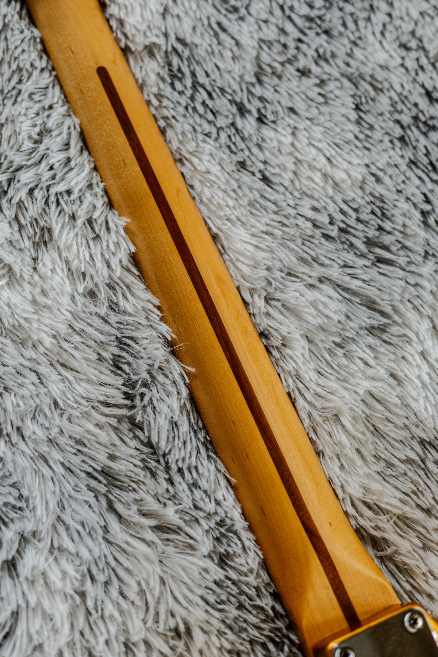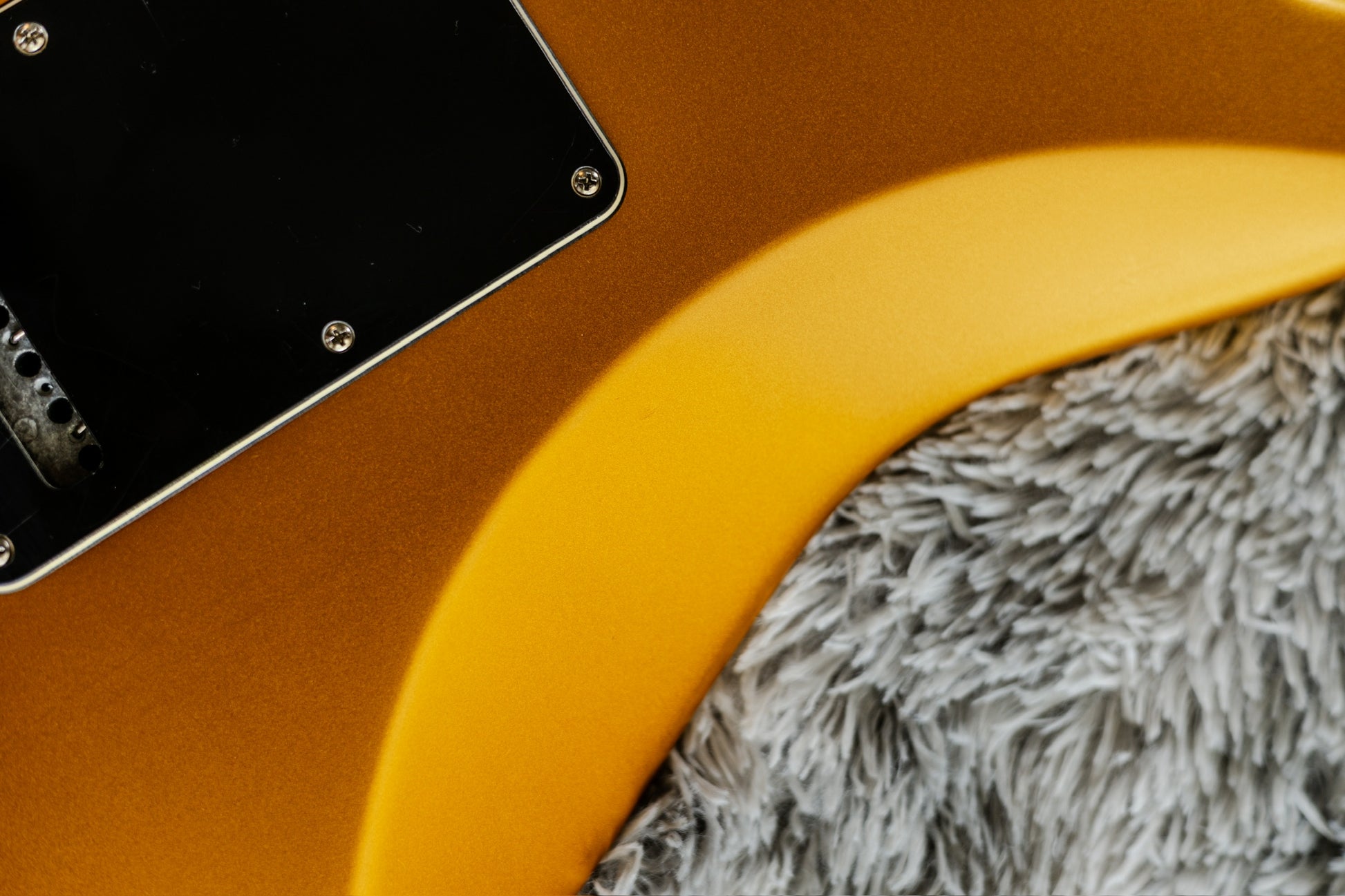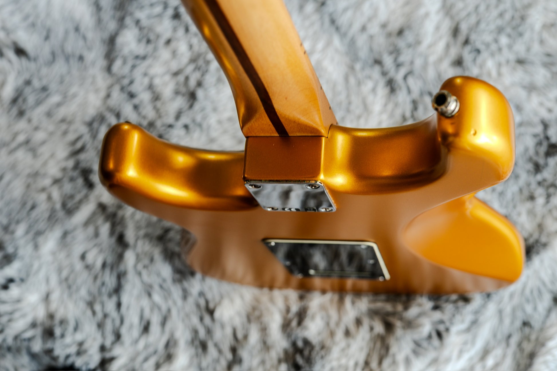 This particular Strat is in great shape overall. It’s got a couple of small bumps and spots and some light scratches on the pickguard, but all purely cosmetic — nothing that takes away from its playability or the wow factor of the finish. The satin coat has held up extremely well and feels smooth in the hands.
