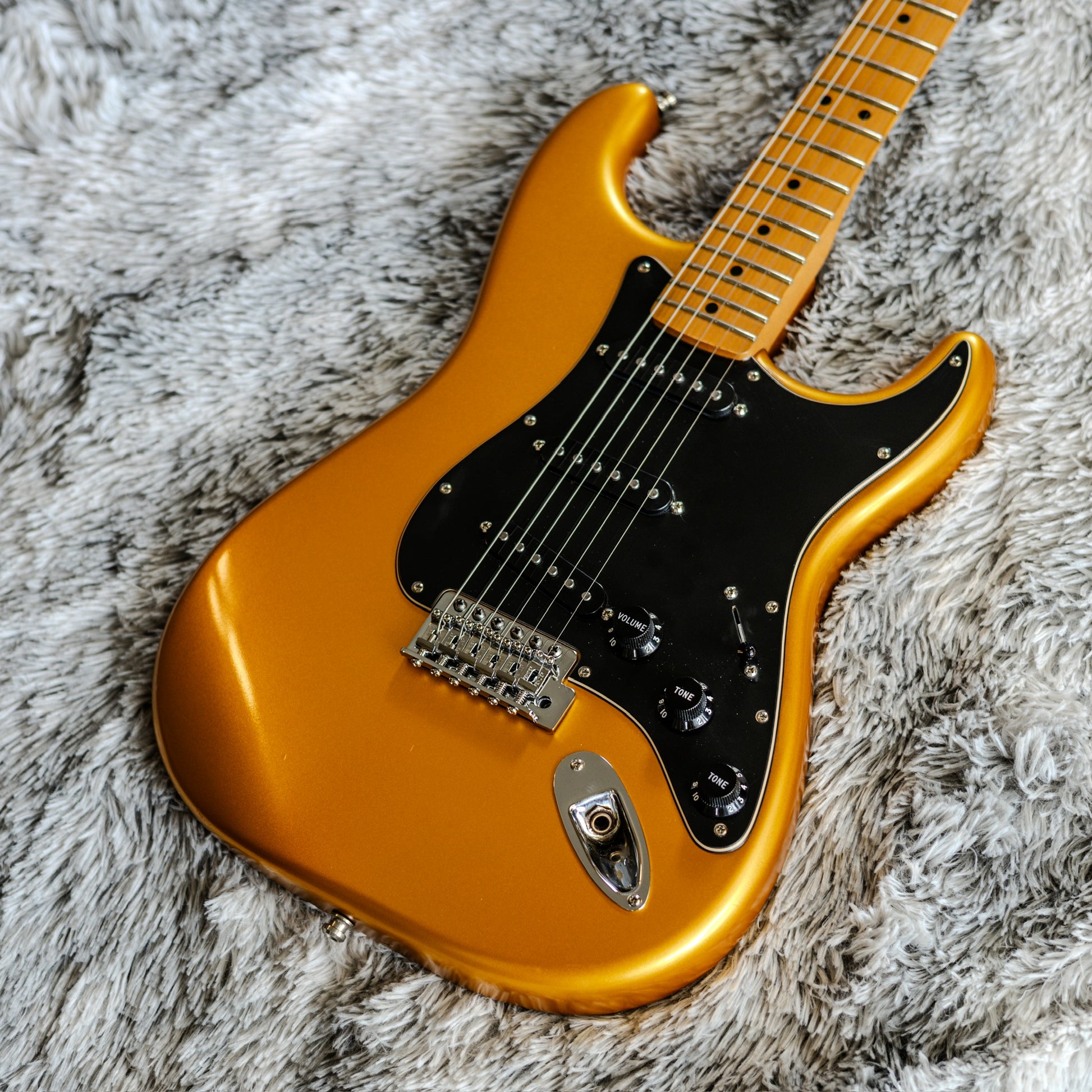 you’re looking for a Strat that turns heads before you even play a note, this is the one. Fender only did a super limited run of the Satin Blaze Gold finish, and you almost never see these pop up. Pictures don’t do it justice — in person it has a deep, brushed metallic look that shifts beautifully in the light.